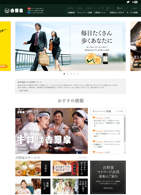 いつも株式会社吉野家公式ウェブサイトにアクセスいただき、誠にありがとうございます。この度、当社ウェブサイトをリニューアルいたしました。