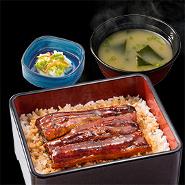 鰻重 一枚盛(790 円)、二枚盛(1,190 円)、三枚盛(1,690 円) 鰻皿 一枚皿(690 円)、二枚皿(1,090 円)、三枚皿(1,590 円) 鰻重セット 一枚盛(860 円)、二枚盛(1,260 円)、三枚盛(1,760 円) 鰻重牛小鉢セット 一枚盛(930 円)、二枚盛(1,330 円)、三枚盛(1,830 円) 鰻重しじみ汁セット 一枚盛(960 円)、二枚盛(1,350 円)、三枚盛(1,850 円) 鰻重みそ汁牛小鉢セット 一枚盛(1,000 円)、二枚盛(1,400 円)、三枚盛(1,900 円)