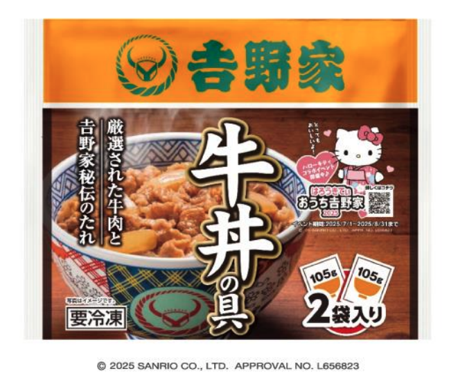 キャンペーン期間中、ハローキティが印刷された特別パッケージの冷凍牛丼の具 105g 2 パック入りを全国の量販店で販売いたします。