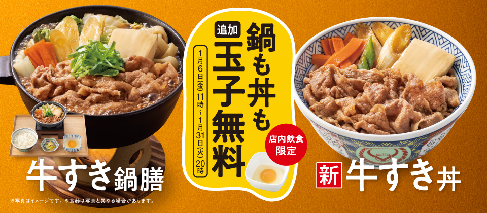 冬の定番商品『牛すき鍋膳』や新登場した『牛すき丼』など「牛すき」関連商品を店内飲食でご注文いただいたお客様に限り、追加の玉子を無料で提供するキャンペーンを、1月6日(金)11時から1月31日(火)20時までの期間、全国の吉野家店舗で実施します。